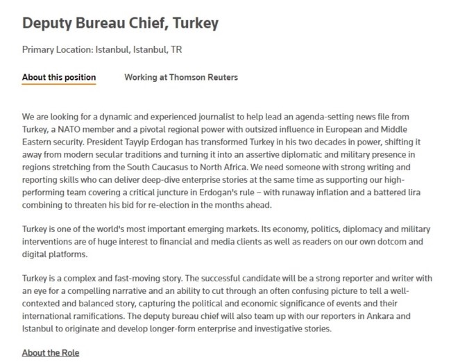 Η αγγελία δημοσιεύθηκε στις αρχές του μήνα, με καταληκτική ημερομηνία την 28η Δεκεμβρίου και μεταξύ άλλων αναγράφεται: "ο Ερντογάν έχει μεταμορφώσει την Τουρκία στις δύο δεκαετίες στην εξουσία του, απομακρύνοντάς την από τις σύγχρονες κοσμικές παραδόσεις και μετατρέποντάς τη σε μια ισχυρή διπλωματική και στρατιωτική παρουσία σε περιοχές που εκτείνονται από τον Νότιο Καύκασο έως τη Βόρεια Αφρική", ενώ αναφέρει ακόμα ότι αναζητεί "κάποιον με ισχυρές δεξιότητες γραφής και με γνώσεις, που να μπορεί να προσφέρει αναλυτικά ρεπορτάζ από κοινού με την υποστήριξη της υψηλών επιδόσεων ομάδας μας που καλύπτει μια κρίσιμη συγκυρία της διακυβέρνησης Ερντογάν – με τον εκτροχιασμένο πληθωρισμό και την υποτιμημένη λίρα να απειλούν την προσπάθειά του για επανεκλογή τους επόμενους μήνες".