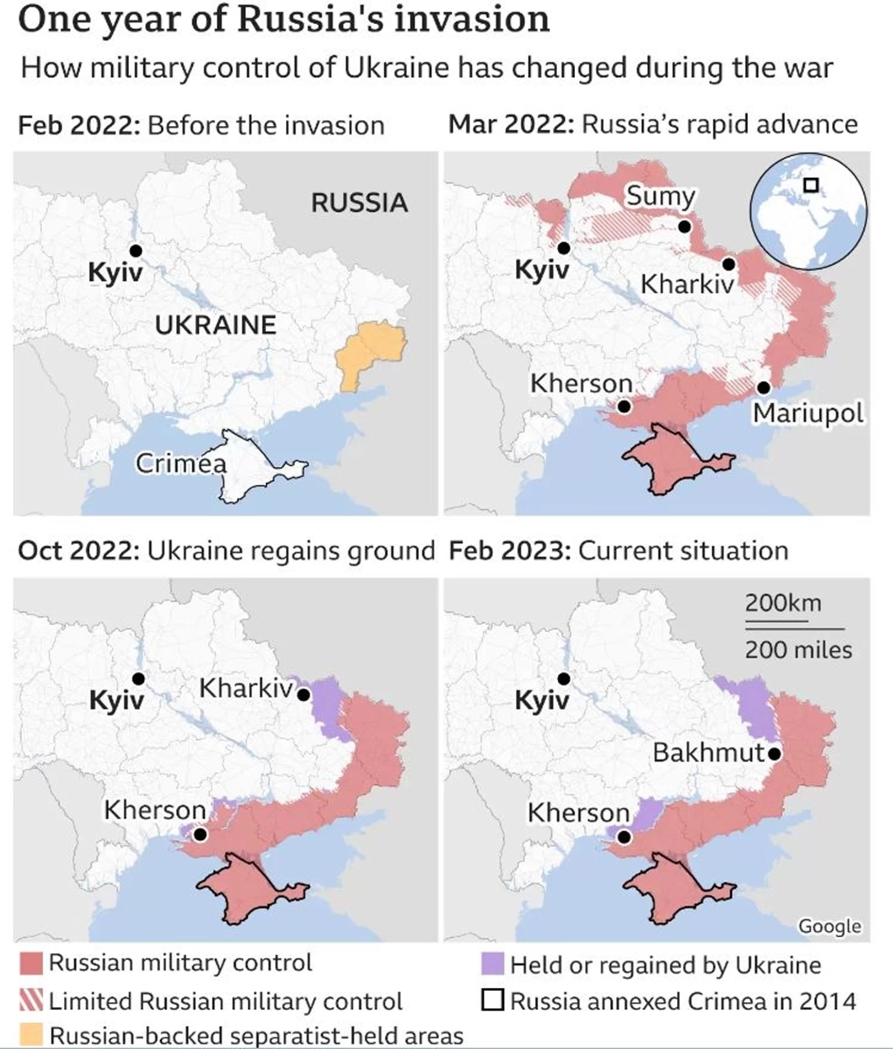 Όταν ο Βλαντιμίρ Πούτιν έστειλε περί τους 200.000 στρατιώτες στην Ουκρανία στις 24 Φεβρουαρίου 2022, υπολόγιζε, προφανώς λανθασμένα, ότι θα μπορούσε να καταλάβει το Κίεβο, μέσα σε λίγες μέρες και να καθαιρέσει την κυβέρνηση Ζελένσκι. Η αρχική ρητορική της αποστρατιωτικοποίησης και αποναζιστικοποίησης της Ουκρανίας και η υπεράσπιση των ρωσώφωνων του Ντονμπάς, που ειδικά στη μαρτυρική Μαριούπολη κόστισε ανυπολόγιστο αριθμό ανθρώπινων ζωών, έχει πια ξεχαστεί.