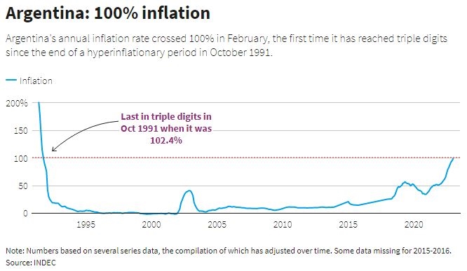 Η Αργεντινή βρίσκεται στη θηλιά του πληθωρισμού που αναμένεται να ξεπεράσει το 100% σε ετήσια βάση, όταν οι αρχές δημοσιεύσουν στοιχεία Φεβρουαρίου αργότερα την Τρίτη. Αυτή θα είναι η πρώτη φορά που ο πληθωρισμός θα σκαρφαλώσει σε τριψήφιο νούμερο μετά από μια περίοδο του υπερπληθωρισμού το 1991.