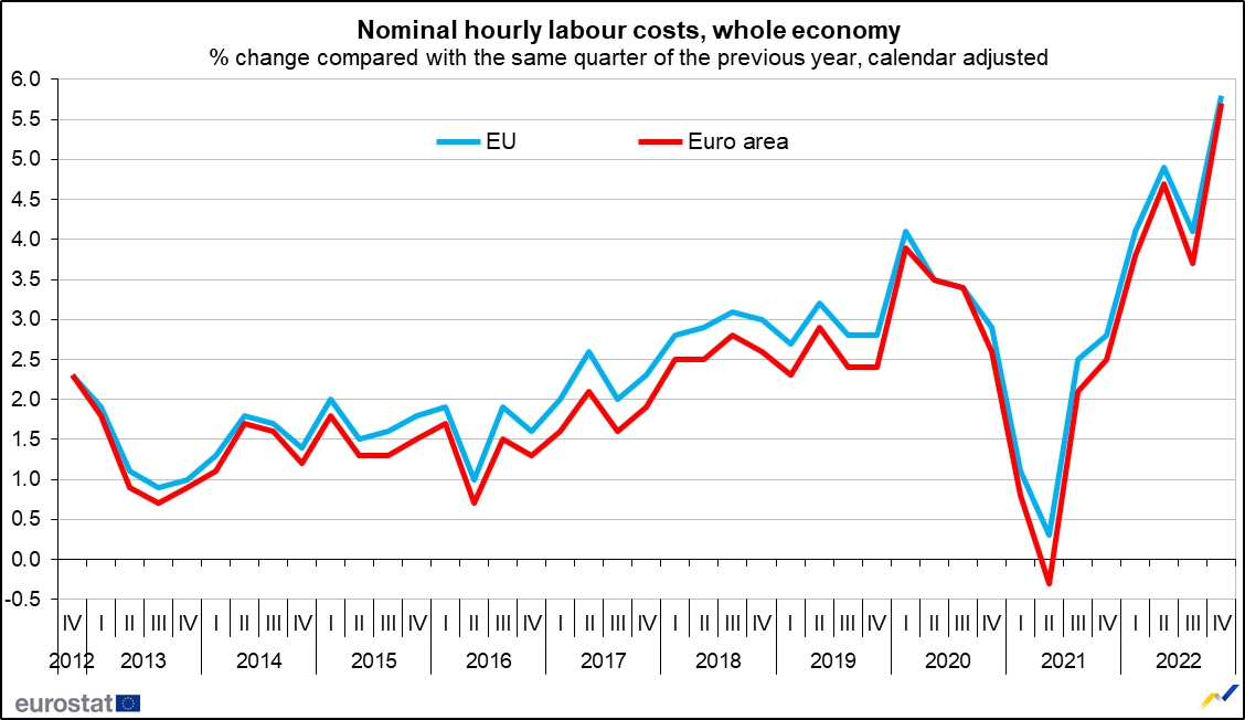 Σημαντική αύξηση παρουσίασε το κόστος εργασίας στην ευρωζώνη στο κλείσιμο του 2022, με ανοδική αναθεώρηση παράλληλα των στοιχείων του τρίτου τριμήνου, αν και η συνιστώσα των μισθών συνέχισε να "τρέχει" στο ήμισυ περίπου του πληθωρισμού.