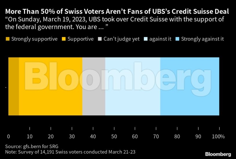 Όπως αναφέρει το Bloomberg, συνολικά το 54% ήταν κατά ή έντονα κατά της αμφιλεγόμενης συμφωνίας, δείχνει η δημοσκόπηση της GFS που διεξήχθη μεταξύ 21 και 23 Μαρτίου. Μόλις 1 στους 20 Ελβετούς, ή το 5% των ερωτηθέντων, υποστήριξε σθεναρά την απόφαση και ένα άλλο 30% υποστήριξε χλιαρά την εξαγορά, η οποία αποτέλεσε αντικείμενο διαπραγμάτευσης το περασμένο Σαββατοκύριακο.