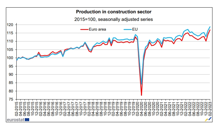 Σύμφωνα με τα στοιχεία της Eurostat, τον Ιανουάριο του 2023, η παραγωγή στις κατασκευές αυξήθηκε κατά 3,8% στη ζώνη του ευρώ και κατά 3,3% στην ΕΕ.