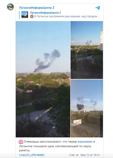 Βίντεο που δημοσιοποιήθηκαν σε πλατφόρμες κοινωνικής δικτύωσης δείχνουν πυκνό μαύρο καπνό να υψώνεται στον ουρανό της πόλης Λουχάνσκ, όπου αναφέρθηκε ότι δύο πύραυλοι έπληξαν βιομηχανική εγκατάσταση.