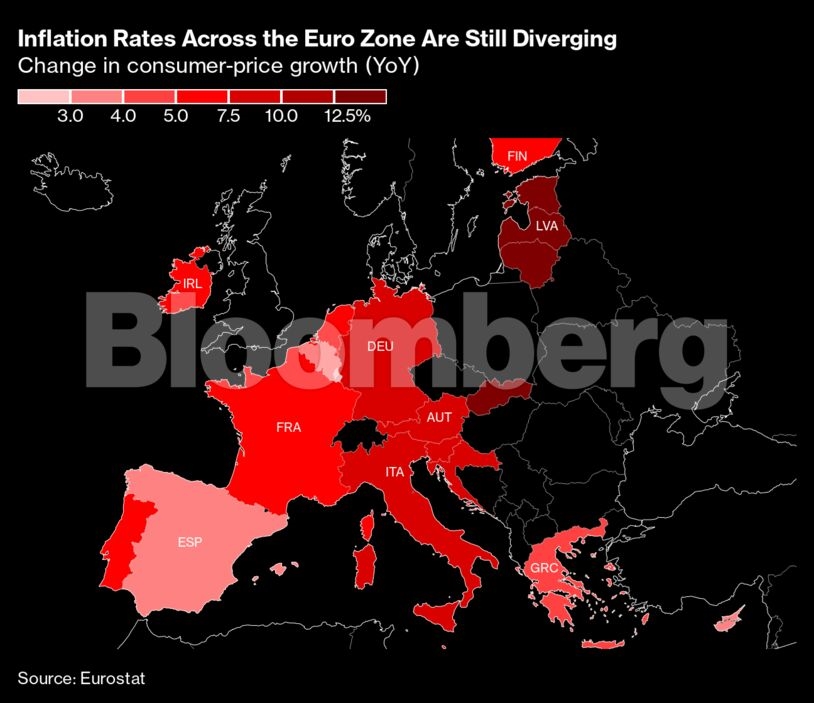 Η Κομισιόν σημείωσε ότι ο υψηλός πληθωρισμός, ευρισκόμενος τώρα στο 7%, είναι το φόντο έναντι των δημοσιονομικών και μακροοικονομικών ανισορροπιών που εξελίσσονται τώρα. Επιπλέον, "η απόκλιση του πληθωρισμού μεταξύ των κρατών μελών βρίσκεται σε ιστορικά υψηλά επίπεδα", πράγμα που αντιπροσωπεύει κίνδυνο για τη ζώνη του ευρώ.