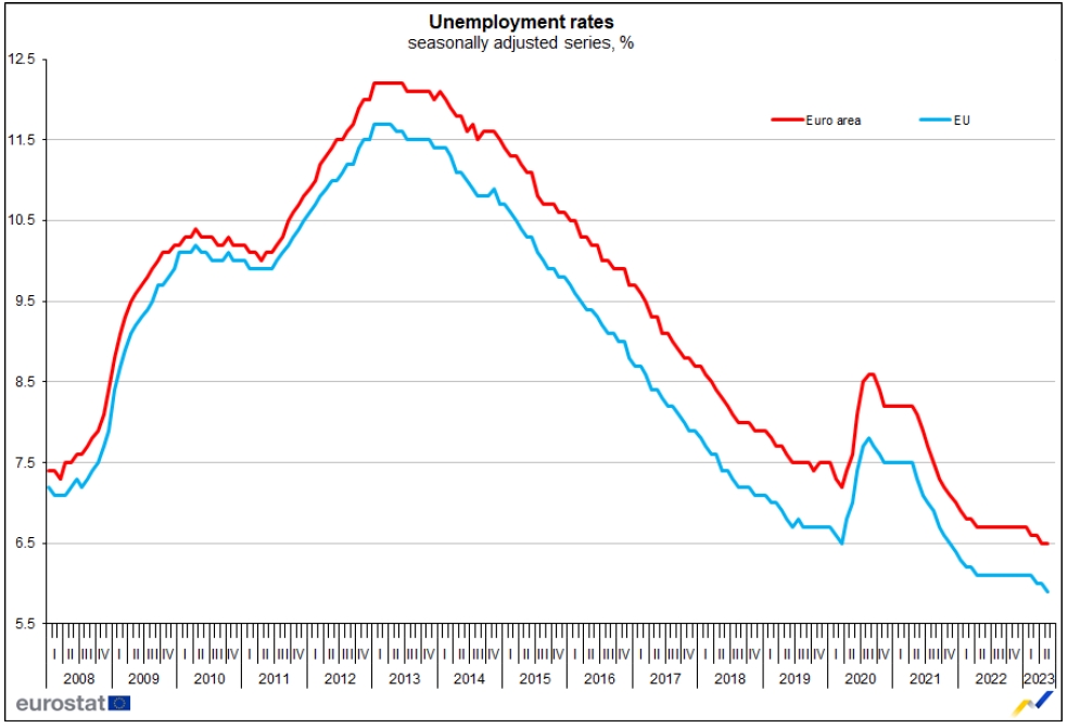 Σύμφωνα με τις εκτιμήσεις της Eurostat, συνολικά 12.937 εκατ. άνθρωποι στην Ε.Ε. εκ των οποίων οι 11,014 εκατ. στη ζώνη του ευρώ, ήταν άνεργοι τον Μάιο του 2023. Σε σύγκριση με τον Μάιο του 2022, η ανεργία μειώθηκε κατά 257.000 άτομα στην Ε.Ε. και κατά 227.000 στη ζώνη του ευρώ.