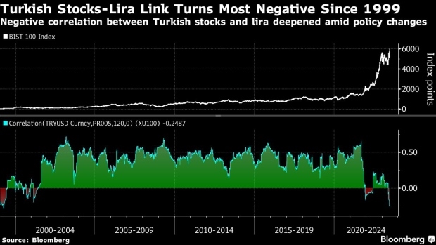 Η λίρα έχει αποδυναμωθεί 23% έναντι του δολαρίου ΗΠΑ από τις εκλογές στις 28 Μαΐου. Ο δείκτης μετοχών σημείωσε ράλι 31% την ίδια περίοδο. Η κυλιόμενη συσχέτιση 120 ημερών μεταξύ των δύο έχει πέσει στο -0,3.