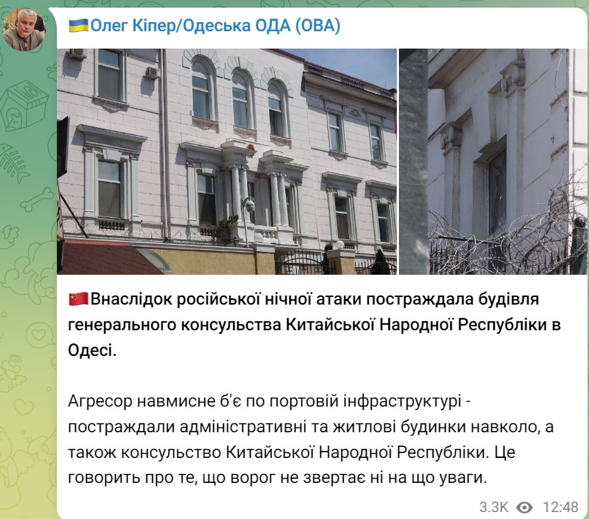 "Ο επιτιθέμενος χτυπά σκόπιμα λιμάνια και διοικητικά και οικιστικά κτίρια σε κοντινή απόσταση υπέστησαν ζημιές, όπως και το προξενείο της Λαϊκής Δημοκρατίας της Κίνας. Αυτό δείχνει ότι ο εχθρός δεν δίνει σημασία σε τίποτα", έγραψε.