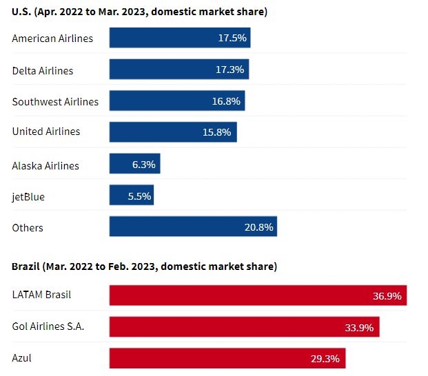 Οι Ηνωμένες Πολιτείες και η Βραζιλία είναι δύο άλλες μεγάλες εγχώριες αεροπορικές αγορές στις οποίες δραστηριοποιούνται ιδιωτικοί αερομεταφορείς. Και η αγορά κατανέμεται ομοιόμορφα μεταξύ τριών ή περισσότερων αεροπορικών εταιρειών και στις δύο χώρες. Στις ΗΠΑ, τέσσερις μεγάλες αεροπορικές εταιρείες - η American Airlines, η Delta Airlines, η Southwest Airlines και η United Airlines - κατέλαβαν περίπου το 67% της εγχώριας αγοράς μεταξύ Απριλίου 2022 και Μαρτίου 2023, ενώ άλλες μικρότερες και περιφερειακές αεροπορικές εταιρείες αντιπροσώπευαν το υπόλοιπο. Στη Βραζιλία, οι τρεις μεγάλες αεροπορικές εταιρείες είναι η LATAM Brasil, η Gol Intelligent Airlines S.A. και η Azul, οι οποίες είχαν μερίδια αγοράς 37%, 33% και 29% αντίστοιχα.