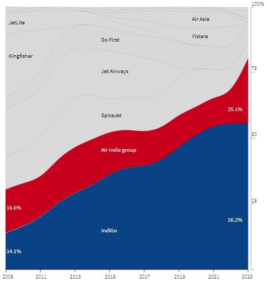 Το μερίδιο της κρατικής Air India στην εγχώρια αγορά μειωνόταν συνεχώς με την πάροδο των ετών. Έπεσε στο 9,6% το 2021 από 17,3% το 2014. Αγοράστηκε τον Ιανουάριο του 2022 από τον όμιλο Tata, ο οποίος διαχειριζόταν ήδη τη Vistara και την AirAsia India εκείνη την εποχή. Τα μερίδια της εγχώριας αγοράς τους το 2022 ήταν 9,2% και 6,2%, αντίστοιχα. Τον Νοέμβριο του περασμένου έτους, η Air India ανακοίνωσε τη συγχώνευση τόσο με τη Vistara όσο και με την AirAsia India. Λαμβάνοντας υπόψη τα μερίδια αγοράς της Vistara και της AirAsia India, το μερίδιο αγοράς των αεροπορικών εταιρειών του ομίλου Air India διαμορφώνεται στο 25% το 2023. Επί του παρόντος, η αίτηση για συγχώνευση εκκρεμεί στην Επιτροπή Ανταγωνισμού της Ινδίας.