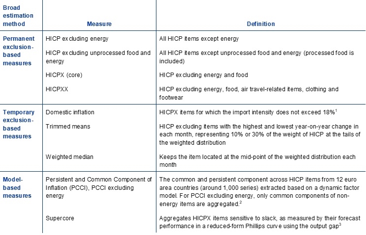 Συγκεκριμένα, η κεντρική τράπεζα απαριθμεί περίπου 10 δείκτες υποκείμενου πληθωρισμού -- που κυμαίνονται από μέτρα που απλώς εξαλείφουν τις παραδοσιακά ασταθείς τιμές των τροφίμων και της ενέργειας έως πιο εξελιγμένους δείκτες που χρησιμοποιούν μαθηματικά μοντέλα για να επικεντρωθούν σε επίμονες συνιστώσες.