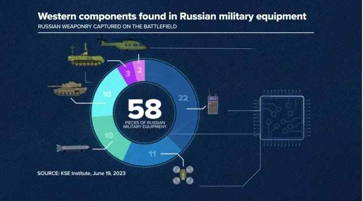 Πράγματι, το Ινστιτούτο KSE -ένα ερευνητικό κέντρο της Οικονομικής Σχολής του Κιέβου- ανέλυσε πρόσφατα 58 αντικείμενα ρωσικού στρατιωτικού εξοπλισμού κρίσιμης σημασίας που ανακτήθηκαν από το πεδίο της μάχης στην Ουκρανία και βρήκε περισσότερα από 1.000 ξένα εξαρτήματα, κυρίως δυτικές τεχνολογίες ημιαγωγών.