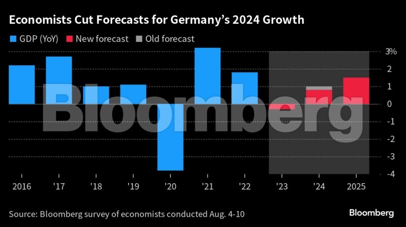 Οι οικονομολόγοι αναμένουν άλλο ένα τρίμηνο μηδενικής ανάπτυξης τους τρεις μήνες έως τον Σεπτέμβριο και εξακολουθούν να βλέπουν τη γερμανική παραγωγή να συρρικνώνεται κατά 0,3% φέτος, ενώ το outlook της για το 2024 υποβαθμίζεται επίσης σε ανάπτυξη 0,8% από 1% προηγουμένως.