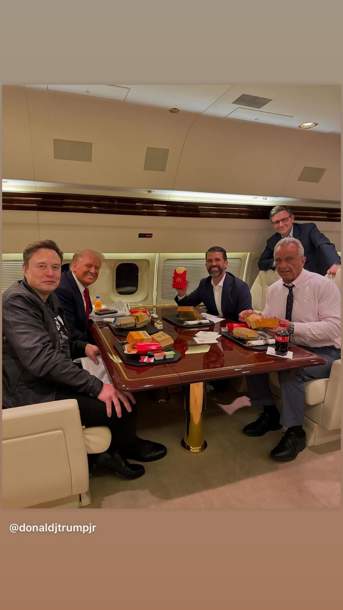 "Το να ξαναδώσουμε στην Αμερική την υγεία της αρχίζει από ΑΥΡΙΟ", ήταν η λεζάντα που έβαλε, μάλλον αποπειρώμενος να κάνει χιούμορ, ο Ντόναλντ Τραμπ ο νεότερος, ο μεγαλύτερος γιος του μεγιστάνα, στη φωτογραφία που μεταφόρτωσε στο Instagram από το δείπνο αυτό, πάνω στο αεροσκάφος του πατέρα του, με παρόντες επίσης τον δισεκατομμυριούχο Έλον Μασκ καθώς και τον πρόεδρο της απερχόμενης Βουλής των Αντιπροσώπων, τον Μάικ Τζόνσον.