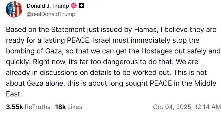 "Με βάση τη δήλωση που μόλις εξέδωσε η Χαμάς, πιστεύω ότι είναι έτοιμη για μια διαρκή Ειρήνη. Το Ισραήλ πρέπει να σταματήσει αμέσως τους βομβαρδισμούς στη Γάζα, ώστε να μπορέσουμε να βγάλουμε τους ομήρους έξω με ασφάλεια και γρήγορα! Αυτή τη στιγμή, είναι πολύ επικίνδυνο να το κάνουμε αυτό. Βρισκόμαστε ήδη σε συζητήσεις για τις λεπτομέρειες που πρέπει να καθοριστούν. Αυτό δεν έχει να κάνει μόνο με τη Γάζα, αλλά με την πολυπόθητη Ειρήνη στη Μέση Ανατολή", αναφέρει ο Τραμπ.