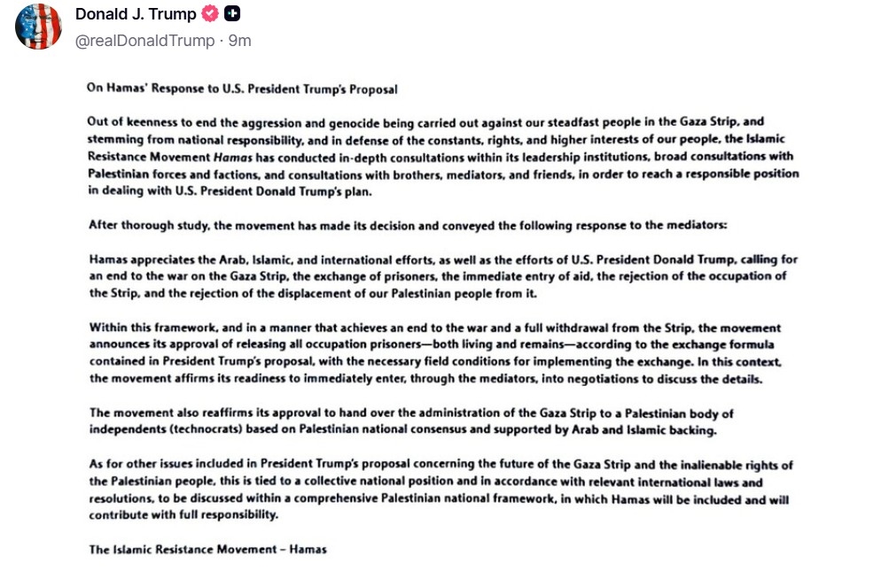 Η Χαμάς "είναι έτοιμη για μια διαρκή ειρήνη" δήλωσε, με ανάρτησή του στο TruthSocial o Αμερικανός πρόεδρος Ντόναλντ Τραμπ, αντιδρώντας στην απάντηση που εξέδωσε την Παρασκευή το βράδυ η παλαιστινιακή οργάνωση στην πρότασή του για τη Γάζα.