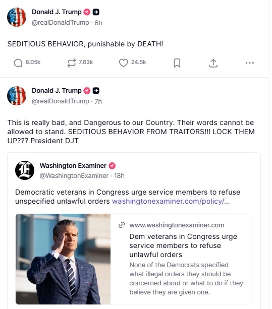 "Αυτό είναι πραγματικά κακό και επικίνδυνο για τη χώρα μας", έγραψε ο πρόεδρος των ΗΠΑ στο δίκτυό του Truth Social, σχολιάζοντας ένα άρθρο σχετικά με την κλήση που έκαναν στο X έξι Δημοκρατικά μέλη της Βουλής των Αντιπροσώπων και της Γερουσίας, όλα εκ των οποίων είχαν υπηρετήσει στο παρελθόν στον στρατό ή στις υπηρεσίες πληροφοριών.