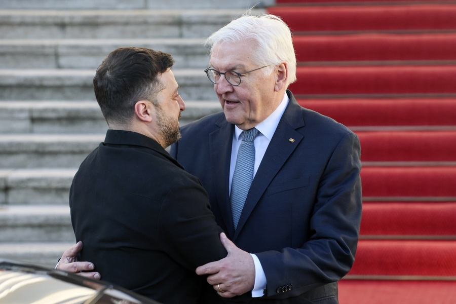Ο Ουκρανός πρόεδρος Βολοντίμιρ Ζελένσκι στο μεταξύ συναντήθηκε με τον ομοσπονδιακό πρόεδρο Φρανκ-Βάλτερ Σταϊνμάιερ, ο οποίος τον υποδέχθηκε αγκαλιάζοντάς τον και λέγοντας "Γεια σου, φίλε μου!".