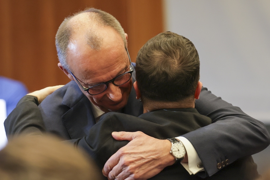 Μετά την ομιλία του, την οποία παρακολούθησε και ο Βολοντίμιρ Ζελένσκι, οι δύο ηγέτες αγκαλιάστηκαν, με τον κ. Μερτς να είναι εμφανώς συγκινημένος.