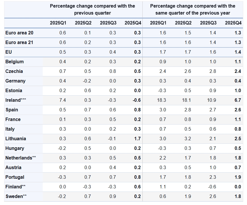 Ειδικότερα, σύμφωνα με τα προκαταρκτικά στοιχεία που δημοσίευσε η Eurostat, το δ' τρίμηνο του 2025, το εποχικά προσαρμοσμένο ΑΕΠ αυξήθηκε κατά 0,3% τόσο στην Ευρωζώνη όσο και στην ΕΕ, σε σύγκριση με το προηγούμενο τρίμηνο. Το τρίτο τρίμηνο του 2025, το ΑΕΠ είχε αυξηθεί κατά 0,3% στη ζώνη του ευρώ και κατά 0,4% στην ΕΕ. Οι οικονομολόγοι που συμμετείχαν σε έρευνα του Bloomberg, προέβλεπαν αύξηση 0,2%.