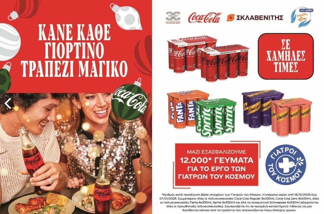 Η δύναμη όμως αυτής της πρωτοβουλίας πολλαπλασιάζεται από τη συμμετοχή όλων μας. Από το Σάββατο 18 Δεκεμβρίου 2025 έως και την Τετάρτη 7 Ιανουαρίου 2026, κάθε αγορά των αγαπημένων μας προϊόντων Coca-Cola, Fanta, Sprite και Schweppes από τα καταστήματα ΣΚΛΑΒΕΝΙΤΗΣ μετατρέπεται σε ένα δώρο αλληλεγγύης. Αυτή η καθημερινή, απλή επιλογή αποτελεί τη βασική πλευρά της μαγείας: μαζί, καταναλωτές και Coca-Cola Τρία Έψιλον, στηρίζουν απευθείας το ανθρώπινο έργο των Γιατρών του Κόσμου, διασφαλίζοντας ότι ακόμα περισσότερα γεύματα θα φτάσουν σε όσους περισσότερο τα χρειάζονται. Είναι η επιβεβαίωση ότι η αληθινή μαγεία των γιορτών δημιουργείται όταν ανοίγουμε τις καρδιές και δρούμε συλλογικά.