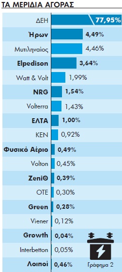 Οι τρεις πρώτοι, Ήρων, Μυτιληναίος και Elpedison, έχουν µερίδιο 12,59%, ενώ τέσσερις ακόµα πάροχοι, Watt & Volt (µε ισχυρή παρουσία στη χαµηλή τάση), NRG, Vοlterra και ΕΛΤΑ, έχουν πάνω από 1%. Σηµαντική είναι η άνοδος µέσα σε µόλις λίγους µήνες της Ελληνικής Εταιρείας Ενέργειας και της ZeniΘ (0,49 και 0,39% αντίστοιχα), ενώ η εικόνα στους υπόλοιπους µικρούς παίκτες εµφανίζεται σταθερή.