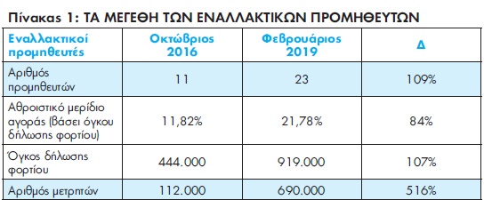 ■ Ο ΑΡΙΘΜΟΣ ΤΩΝ ΠΕΛΑΤΩΝ που προµηθεύονται ρεύµα από εναλλακτικούς παρόχους (αριθµός εκπροσωπούµενων µετρητών) εξαπλασιάστηκε στους 690.000 µετρητές κατά τον Φεβρουάριο 2019. Με τον τρέχοντα ρυθµό µετακίνησης (περίπου 35.000 µετρητές µηνιαίως), το νούµερο αυτό θα έχει υπερβεί τους 1.000.000 έως το τέλος του 2019 (πίνακας 1).