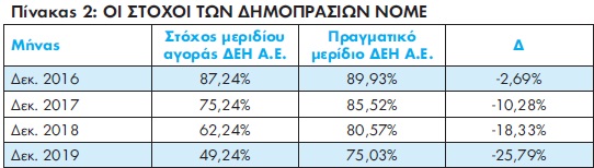 Βεβαίως, τα ΝΟΜΕ δεν πέτυχαν τον στόχο (πίνακας 2) που είχε τεθεί για τη µείωση του µεριδίου της ΔΕΗ στο 50% στο τέλος του έτους (49,24% µέχρι τον Δεκέµβριο). Επιπλέον, όπως έχει πολλάκις τονίσει η ΔΕΗ, λόγω των δηµοπρασιών υφίσταται οικονοµική ζηµία από την ενέργεια που θα διέθετε στην Οριακή Τιµή του Συστήµατος σε υψηλότερη τιµή. Πλέον, το βασικό ερώτηµα αφορά τη συνέχιση ή όχι του µηχανισµού των δηµοπρασιών. Η απόφαση αναµένεται να ληφθεί µέχρι το φθινόπωρο, από κοινού µε την Κοµισιόν, στο πλαίσιο της αποτίµησης της διαδικασίας των διαγωνισµών. Οι αποφάσεις θα συναρτηθούν και από τις άλλες εξελίξεις στην αγορά, όπως τη λιγνιτική αποεπένδυση της ΔΕΗ αλλά και την πρόοδο του target model, δηλαδή του νέου µοντέλου της αγοράς. Πάντως, οι προµηθευτές έχουν διαµηνύσει ότι, εάν στηριχθεί η αγορά µόνο στις δυνατότητες διµερών συµβάσεων που θα υπάρχουν στο πλαίσιο του target model, τότε υπάρχει σοβαρός κίνδυνος οπισθοδρόµησης. Το πιθανότερο σενάριο είναι να υπάρξει ένα σχέδιο-γέφυρα για τη µετάβαση στο νέο καθεστώς του target model, το οποίο ούτως ή άλλως δεν αναµένεται να είναι πλήρως λειτουργικό πριν από τα µέσα του 2020 (περιλαµβανοµένης και της σύζευξης µε τις περιφερειακές αγορές της Νοτιοανατολικής Ευρώπης).