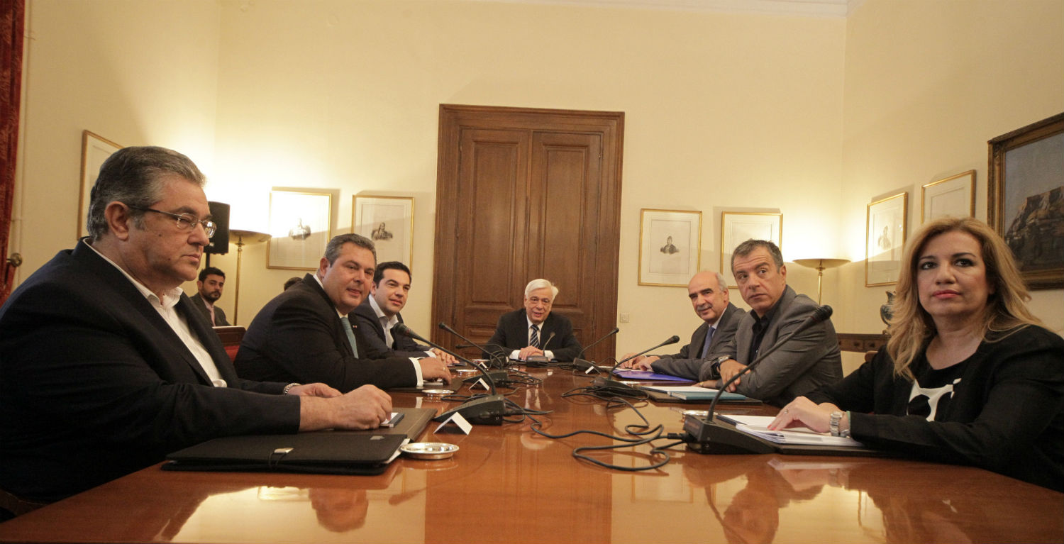 Από τις δέκα το πρωί, ο πρωθυπουργός, Αλέξης Τσίπρας, ο προσωρινός πρόεδρος της Νέας Δημοκρατίας, Βαγγέλης Μεϊμαράκης, ο επικεφαλής του Ποταμιού, Σταύρος Θεοδωράκης, ο πρόεδρος των Ανεξάρτητων Ελλήνων, Πάνος Καμμένος και η πρόεδρος του ΠΑΣΟΚ, Φώφη Γεννηματά, θέτουν επί τάπητος τις λεπτομέρειες της τελευταίας πρότασης του επικεφαλής της Ευρωπαϊκής Επιτροπής, Jean Claude Juncker, καθώς και το τελευταίο σχέδιο του Μεγάρου Μαξίμου, επιχειρώντας να διαμορφώσουν μία φόρμουλα συμφωνίας με τους εταίρους.