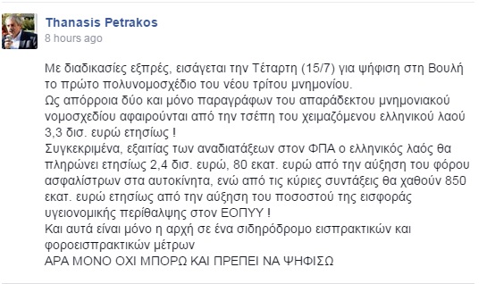 Ο κ. Πετράκος αναφέρει χαρακτηριστικά: "Με διαδικασίες εξπρές, εισάγεται την Τέταρτη (15/7) για ψήφιση στη Βουλή το πρώτο πολυνομοσχέδιο του νέου τρίτου μνημονίου.