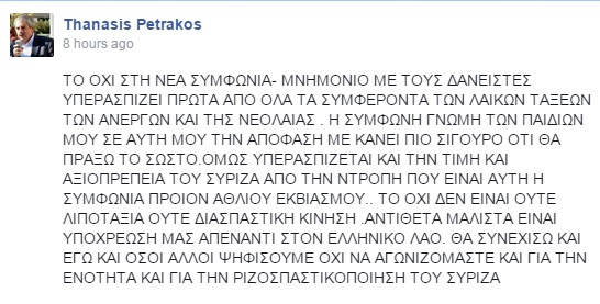 Με δύο αναρτήσεις στην προσωπική του σελίδα στο facebook ο Κοινοβουλευτικός Εκπρόσωπος και βουλευτής Μεσσηνίας του ΣΥΡΙΖΑ, Θανάσης Πετράκος, προανήγγειλε την καταψήφιση των νέων μέτρων σήμερα στη Βουλή.