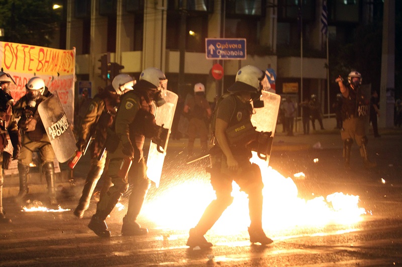 Νωρίτερα, μικρή ομάδα διαδηλωτών που βρισκόταν στην αρχή της Πανεπιστημίου δέχτηκε επίθεση με κλομπ από άνδρες των ΜΑΤ. Αστυνομικές δυνάμεις προχώρησαν σε δεκάδες προσαγωγές.