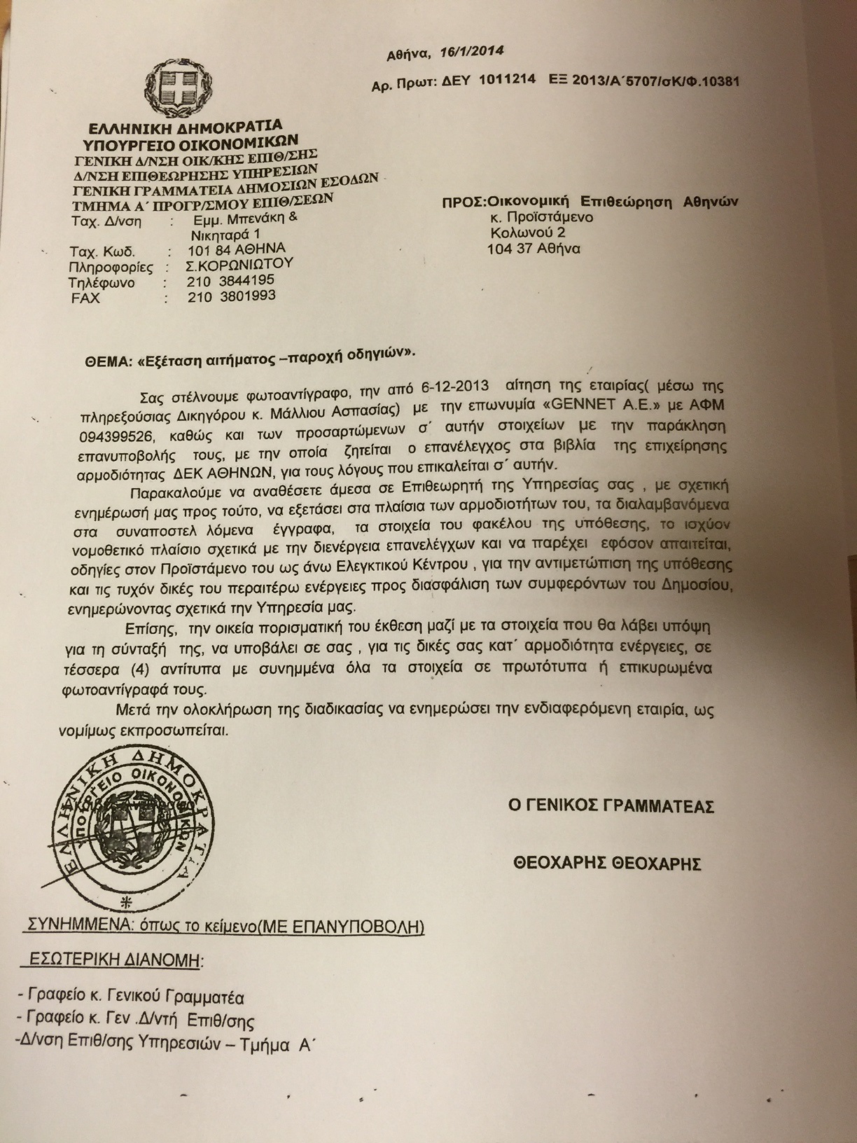 -Η επιθεώρηση διαλύθηκε αλλά για το θέμα εισηγήθηκε αρνητικά η προϊσταμένη της Α επιτροπής Ελέγχου για 4 λόγους (έλλειψη νέων στοιχείων κλπ) και συναίνεσε η Διεύθυνση Ελέγχου. Μάλιστα στις 11-2-14 η διεύθυνση γνωστοποίησε στην εταιρεία πως το αίτημά της απορρίφθηκε. Από τότε και μέχρι που αποχώρησε απο τη θέση του τον Ιούνιο του 2014 ο κ. Θεοχάρης ουδέποτε επανήλθε κάνοντας αποδεκτή την γνωμοδότηση των υπηρεσιών του. Η συνέχεια είναι γνωστή αφού η κ. Σαββαΐδου διέταξε τον επανέλεγχο, σύμφωνα με την κατηγορία δε, χωρίς να λάβει υπόψιν της τις αρνητικές γνωμοδοτήσεις των υπηρεσιών της.