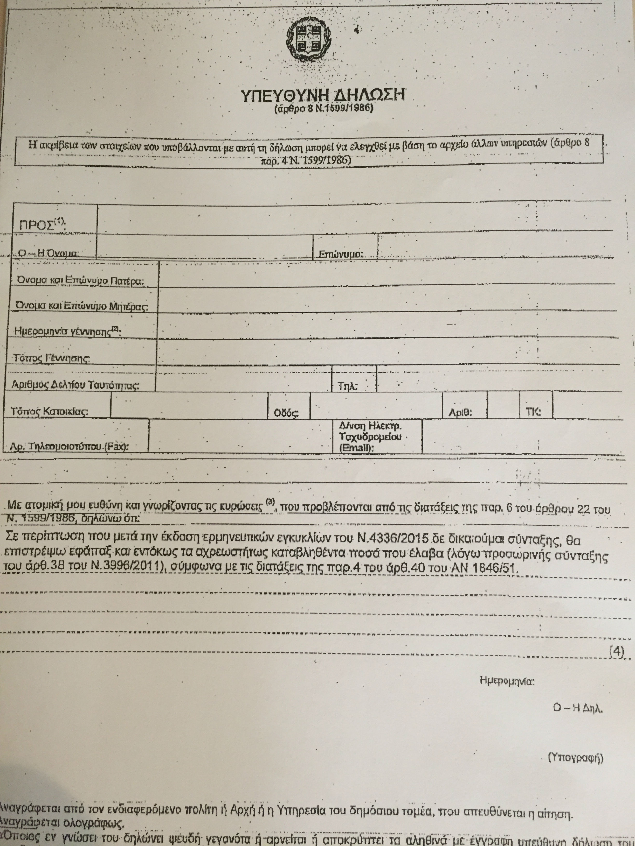 Σύμφωνα με πληροφορίες του Capital.gr, όποιος ασφαλισμένος πάει να καταθέσει τα δικαιολογητικά του για να λάβει τη σύνταξη του, πρέπει ταυτόχρονα να υπογράψει μία "υπεύθυνη δήλωση" του νόμου 1599/1986 (σ.σ. του νόμου 105 για τους παλιότερους...), η οποία προβλέπει ότι :