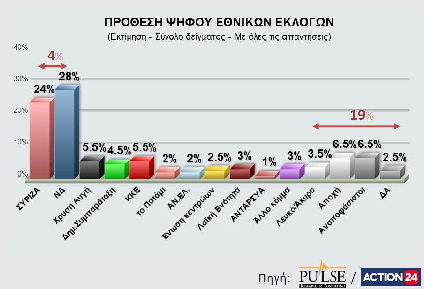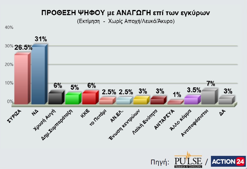 Διαφορά 4,5% (ΝΔ 31%, ΣΥΡΙΖΑ 26,5%) υπέρ της ΝΔ καταγράφει δημοσκόπηση της Pulse για το Action24 και την εκπομπή Evening Report.