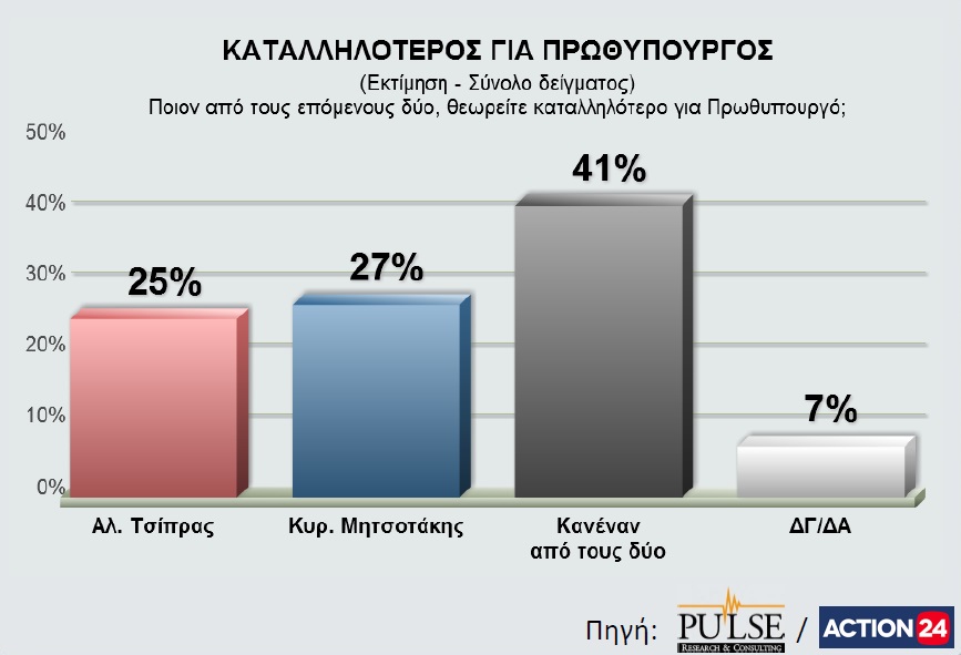 Στην καταλληλότητα για την πρωθυπουργία ο Κυριάκος Μητσοτάκης προηγείται με 27% έναντι 25% του Αλέξη Τσίπρα, ενώ "κανέναν από τους δύο" απαντά το 41%.