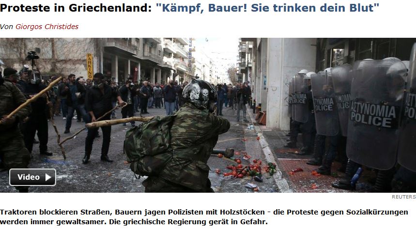 Την επιδείνωση των αντιδράσεων έναντι του ασφαλιστικού και των κοινωνικών περικοπών, κυρίως από τους αγρότες, περιγράφει το γερμανικό μέσο Der Spiegel. "Οι διαδηλωτές διαμαρτύρονται: Μας πίνετε το αίμα! Τα τρακτέρ μπλοκάρουν τους δρόμους, οι αγρότες κυνηγούν τους αστυνομικούς με τις μαγκούρες –οι διαμαρτυρίες ενάντια στις κοινωνικές περικοπές γίνονται βίαιες. Η ελληνική κυβέρνηση βρίσκεται σε κίνδυνο", τονίζει το Der Spiegel.