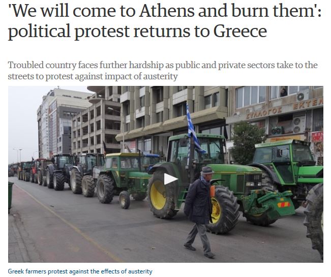 Στα επιπλέον προβλήματα που έρχονται να προστεθούν σε "μια ήδη βασανισμένη χώρα" αναφέρεται ο βρετανικός Guardian παρακολουθώντας πολύ στενά τις κινητοποιήσεις και αντιδράσεις του δημόσιου και ιδιωτικού τομέα με αφορμή την ασφαλιστική μεταρρύθμιση που προωθεί η ελληνική κυβέρνηση. Ιδιαίτερη αναφορά και συνεχή ρεπορτάζ για τα επεισόδια μεταξύ αγροτών και αστυνομικών αρχών που έλαβαν χώρα την Παρασκευή στην Αθήνα. "Θα έρθουμε στην Αθήνα να τους κάψουμε", ο τίτλος του κεντρικού θέματος για τις πολιτικές κινητοποιήσεις που επιστρέφουν στην Ελλάδα.