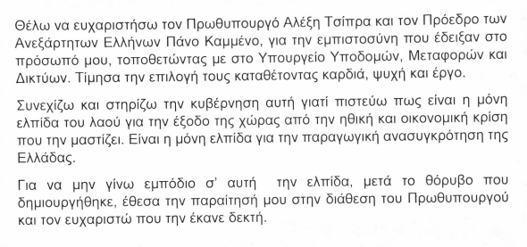 Υπενθυμίζεται ότι ο Παναγιώτης Σγουρίδης υπέβαλε την παραίτησή του την περασμένη Τετάρτη, μετά το πρωτοφανες άδειασμα που επεφύλαξε στον πρωθυπουργό για το θέμα των αγροτών, υποστηρίζοντας grosso modo ότι ο κ. Τσίπρας εξαπάτησε συνειδητά τους αγρότες προς άγραν ψήφων.