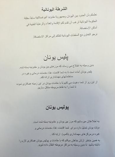 "Σας ενημερώνουμε ότι τα σύνορα μεταξύ Ελλάδας και ΠΓΔΜ έχουν κλείσει. Η Ελλάδα θα σας παράσχει διαμονή, σίτιση, ιατροφαρμακευτική περίθαλψη κ.λπ., όπως και δομές φιλοξενίας. Κατόπιν τούτου, παρακαλούμε για τη συνεργασία σας με τις ελληνικές αρχές, προκειμένου να μεταφερθείτε στους εν λόγω χώρους φιλοξενίας”.