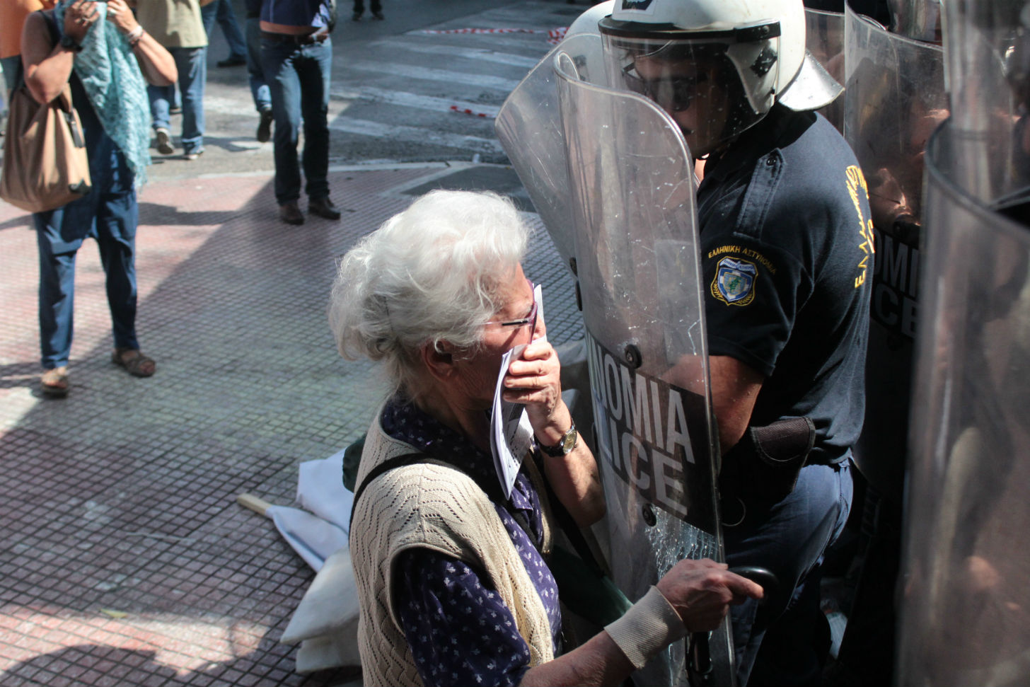 Οι συνταξιούχοι επιχείρησαν να περάσουν προσπαθώντας ταυτόχρονα να ρίξουν, ωθώντας, τη μία κλούβα η οποία ήταν παρατεταγμένη, με αποτέλεσμα οι δυνάμεις των ΜΑΤ που βρίσκονταν εκεί να απαντήσουν με ρίψη χημικών για να διαλυθεί το πλήθος.