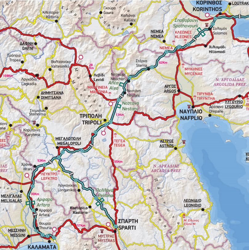 Το τμήμα Κόρινθος – Καλαμάτα είναι μήκους 159 χλμ, ενώ το Λεύκτρο-Σπάρτη έχει μήκος 46 χλμ.