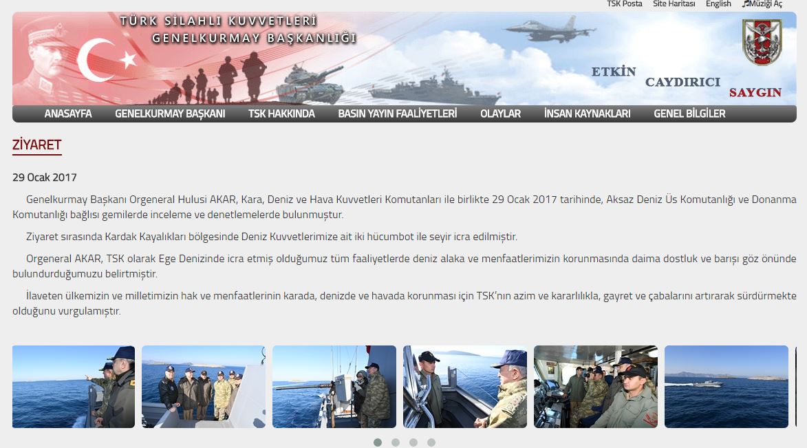 "Ο ΑΓΕΕΘΑ Χουλουσί Ακάρ, μαζί με τους αρχηγούς Στρατού Ξηράς, Ναυτικού και Αεροπορίας επιθεώρησαν την ναυτική βάση Aksaz στις 29 Ιανουαρίου 2017.