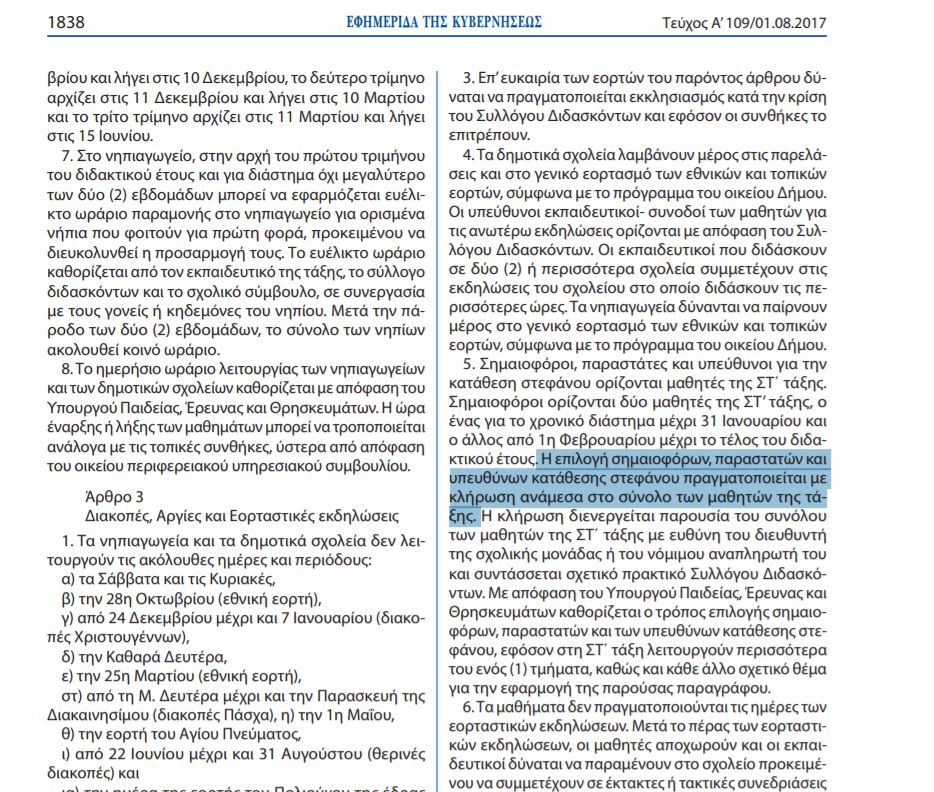 "Η ηγεσία του υπουργείου Παιδείας, πιστή στο δόγμα του εξισωτισμού προς τα κάτω, καταργεί το κριτήριο της επίδοσης για την επιλογή́ σημαιοφόρων, παραστατών και υπευθύνων κατάθεσης στεφάνου και εισάγει την κλήρωση ως τρόπο επιλογής. Επιπλέον, καταργεί την παρουσία σημαιοφόρων στις δοξολογίες.