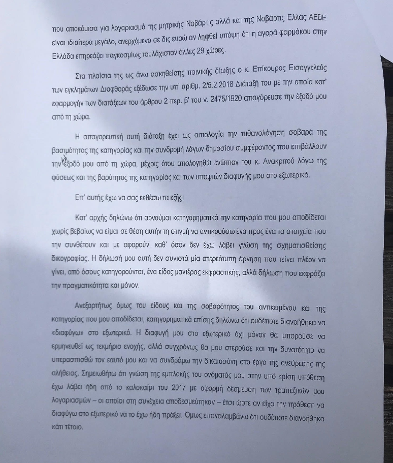 Στο υπόμνημά του ο πρώην αντιπρόεδρος της Novartis σημειώνει εξάλλου πως γνώριζε για την εμπλοκή του ονόματός του στην υπόθεση από το καλοκαίρι του 2017 με αφορμή δέσμευση των τραπεζικών του λογαριασμών –οι οποίοι στη συνέχεια αποδεσμεύτηκαν.
