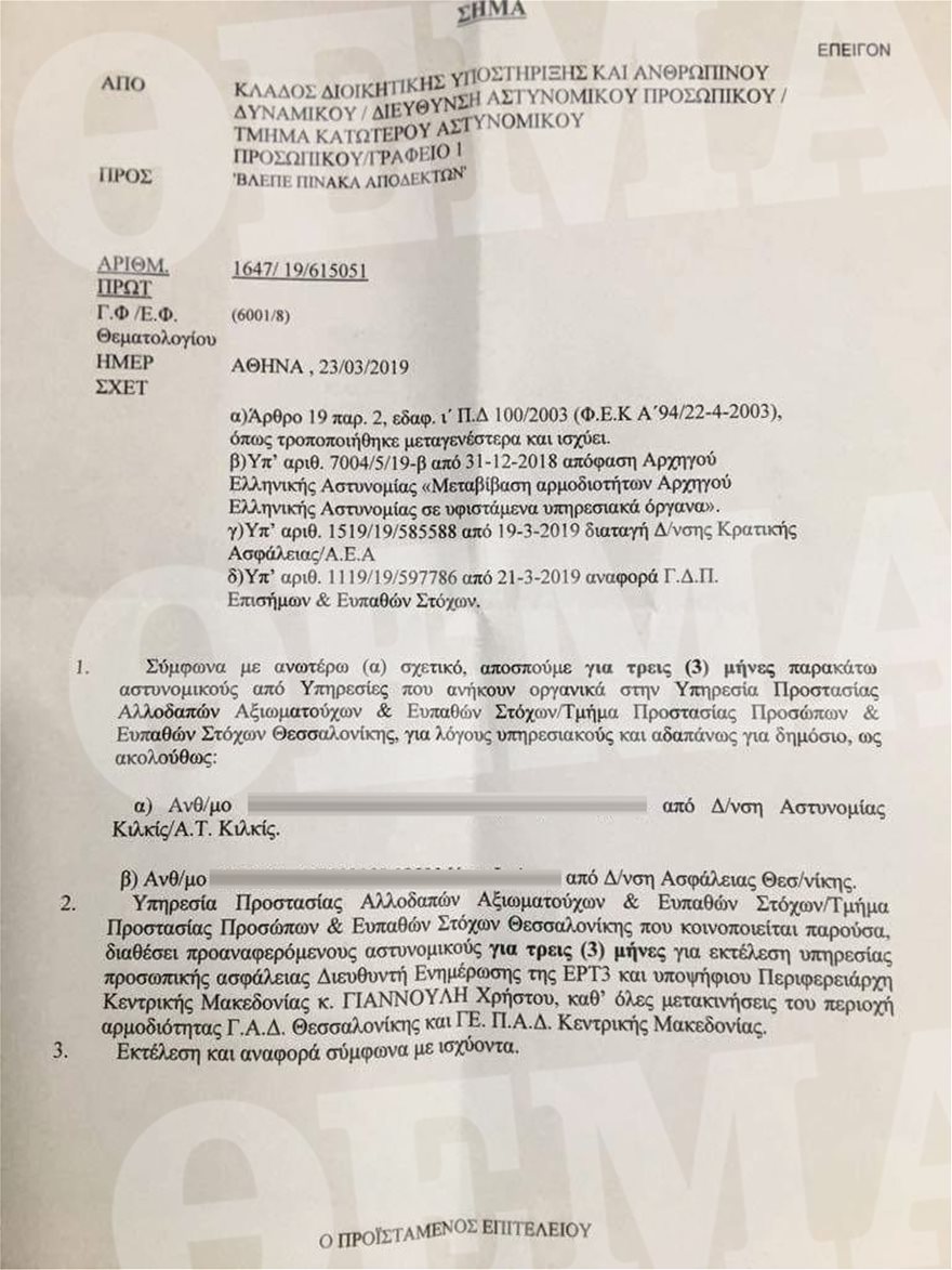 Οι δύο αστυνομικοί θα βρίσκονται στο πλευρό του κ. Γιαννούλη, ο οποίος είναι και διευθυντής ενημέρωσης της ΕΡΤ3, για διάστημα τριών μηνών, όπως αναφέρεται στο έγγραφο που δημοσιεύει το protothema.gr.
