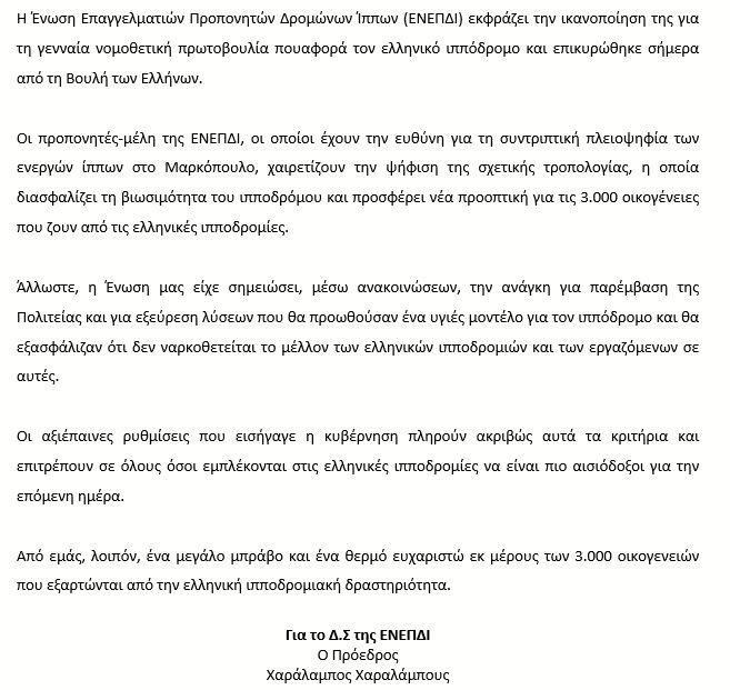 Άλλωστε, η ΕΝΠΔΙ μέσω ανακοινώσεων είχε τονίσει την ανάγκη για παρέμβαση της Πολιτείας και για εξεύρεση λύσεων, που θα προωθούσαν ένα υγιές μοντέλο για τον ιππόδρομο και θα εξασφάλιζαν ότι δεν ναρκοθετείται το μέλλον των ελληνικών ιπποδρομιών και των εργαζόμενων σε αυτές.