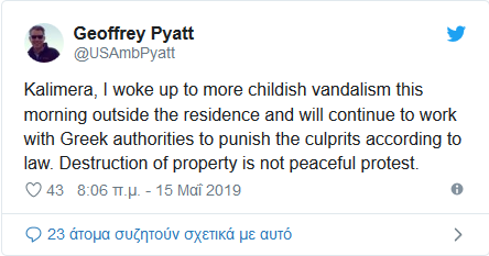 "Καλημέρα, σήμερα ξύπνησα με έναν παδαριώδη βανδαλισμό έξω από το σπίτι μου και θα συνεχίσω να εργάζομαι με τις ελληνικές αρχές για να τιμωρηθούν οι ένοχοι σύμφωνα με τον νόμο. Η καταστροφή της ιδιοκτησίας δεν είναι ειρηνική διαμαρτυρία", έγραψε χαρακτηριστικά ο Αμερικανός πρέσβης στο λογαριαμό του στο Twitter.