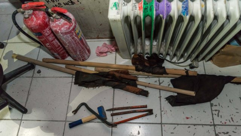 Κατά τη διάρκεια της έρευνας, σύμφωνα πάντα με την ενημέρωση της αστυνομίας, βρέθηκαν και κατασχέθηκαν, μεταξύ άλλων, κοντάρια, κράνη, γάντια, κουκούλες, ρούχα και υλικά για κάλυψη χαρακτηριστικών προσώπου, καθώς και πυροσβεστήρες, διαρρηκτικά εργαλεία, φυλλάδια αναρχικού περιεχομένου, κομμάτια από μάρμαρα και πέτρες που χρησιμοποιούνται σε επιθέσεις.