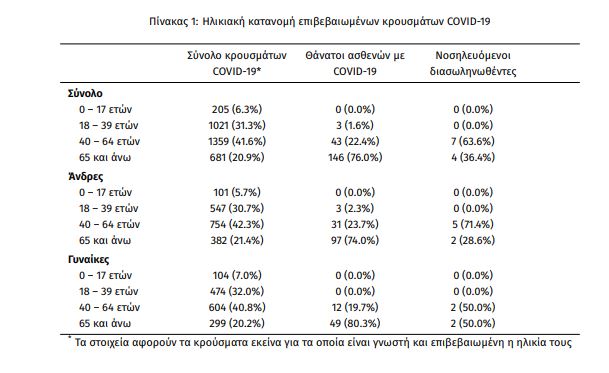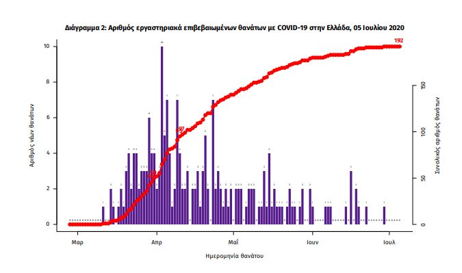 Τέλος, δεν έχει καταγραφεί κανένας νέος θάνατος, ενώ έχουμε 192 θανάτους συνολικά στη χώρα. 61 (31.8%) γυναίκες και οι υπόλοιποι άνδρες. Η διάμεση ηλικία των θανόντων συμπολιτών μας ήταν τα 76 έτη και το 95,8% είχε κάποιο υποκείμενο νόσημα ή/και ηλικία 70 ετών και άνω.