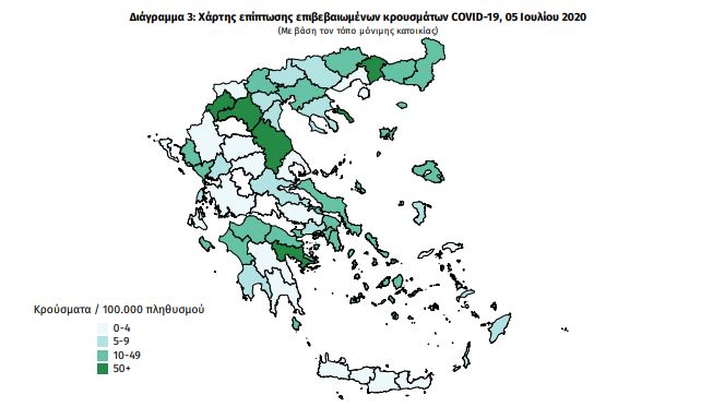 Ο χάρτης ακόλουθος αποτυπώνει τη γεωγραφική κατανομή των συνολικών κρουσμάτων COVID-19 ανά Περιφερειακή Ενότητα της χώρας, με βάση την δηλωθείσα διεύθυνση μόνιμης κατοικίας του ασθενούς.